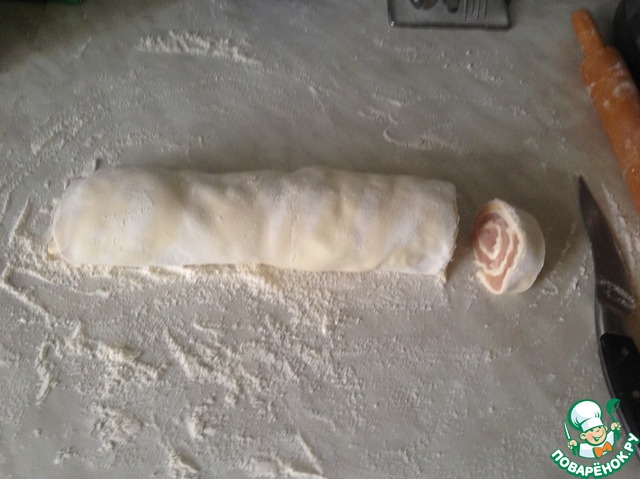 Аккуратненько скрутила рулетом тесто с начинкой.