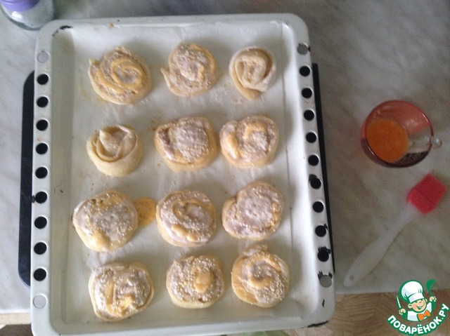 После намазывания можно посыпать кунжутом, думаю, что так будет лучше. Я не додумалась сделать этого после намазывания, поэтому кунжут у меня "утонул" в желтке)))