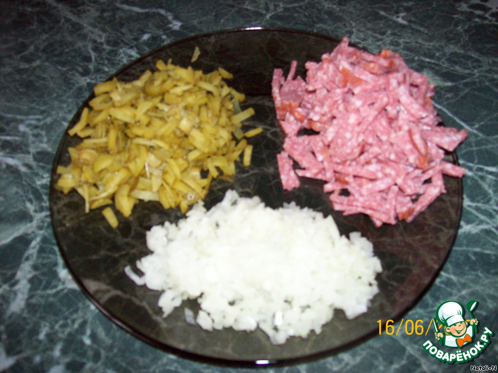 Сначала нарежем все ингредиенты: лук режем очень мелко, огурчики и колбасу соломкой.