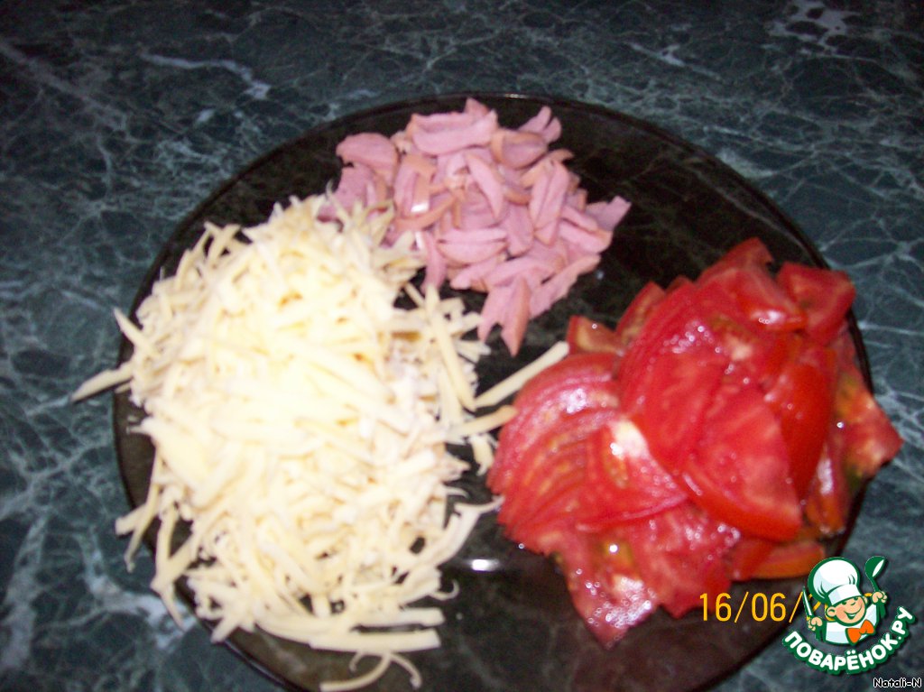 И выложить начинку: сосиски, лук, огурцы, помидоры, колбаса копченая, сверху посыпать сыром