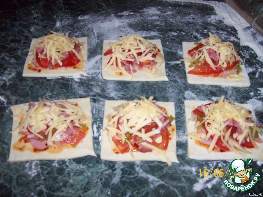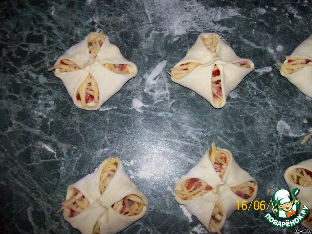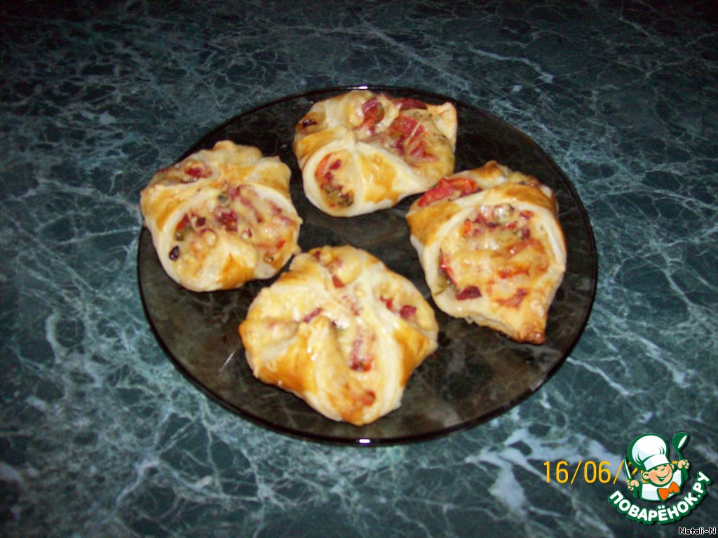 | Этот рецепт у меня вообще из пиццы получился, просто муж у меня любит, чтобы было всего и побольше, и на два укуса, вот так родились эти слойки |