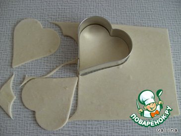 Нагреть духовку до 200 градусов. Выложить противень бумагой для выпекания. При помощи формы вырезать из теста сердечки и положить их на противень.