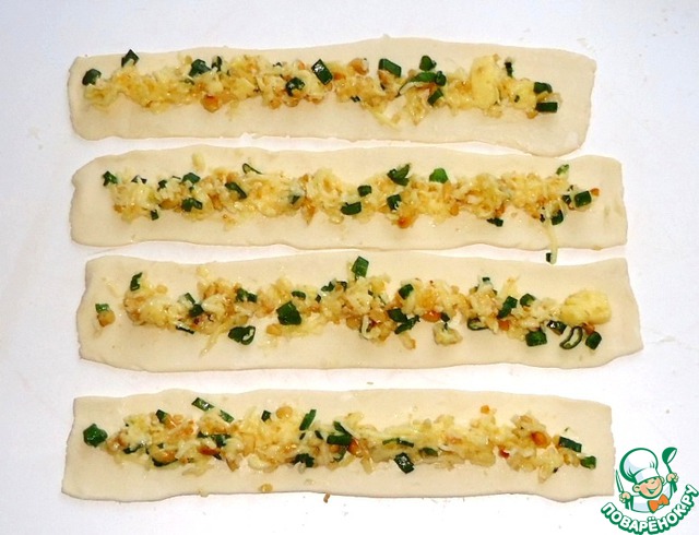 Лучше раскатать все полоски из теста и выложить начинку для того, чтобы начинки хватило на все тесто.
