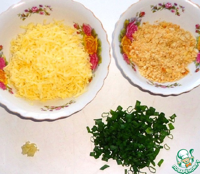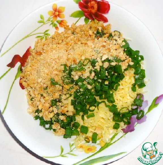 Сначала приготовим начинку для палочек. Для этого арахис обжарить на сухой сковороде, очистить и измельчить. Сыр нужно натереть на крупной или средней тёрке, арахис обжарить на сухой сковороде, очистить и измельчить, чеснок пропустить через пресс, зеленый лук мелко нарезать.