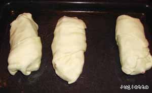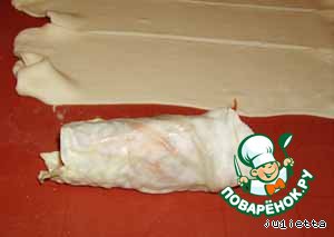 Затем завернуть "голубцы" в ленты теста, уложить на смазанные растительным маслом противни на некотором расстоянии друг от друга.