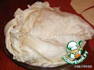 Капусту разобрать на листья, удалить плотную часть у основания, поместить в микроволновку на 10 минут при максимальной мощности.