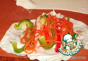 Положить на капустный лист немного сарделек, паприки, корейской моркови (или чего другого по вкусу и фантазии),