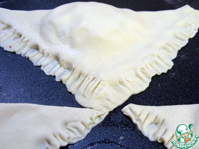 Края треугольников аккуратно сдавливаем (просто прижимаем к столу) сначала пальцами, затем чем-нибудь вроде вилки с большими зубцами. Благодаря этим мерам ни одна слойка у меня не прохудилась по шву при выпекании.