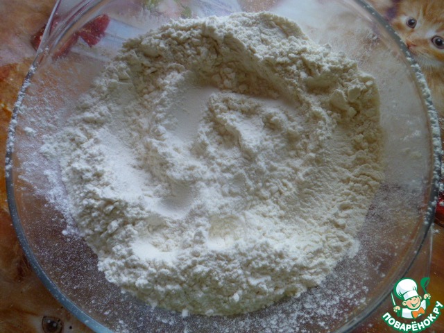 Делаем тесто. На дно миски насыпать 0.5 стакана просеянной муки.