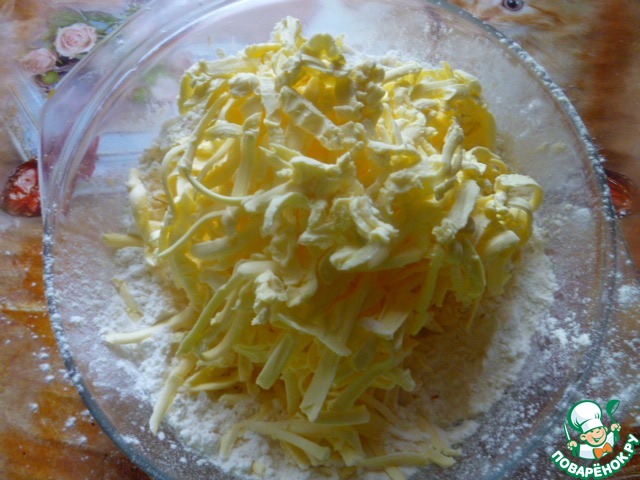 Выкладываем в муку замороженный маргарин.
