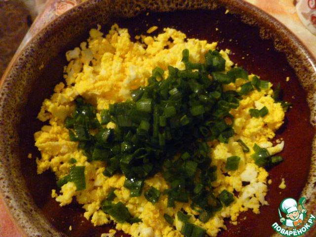 Тем временем готовим начинку. Яйца измельчаем вилкой и соединяем с нарезанным зеленым луком.