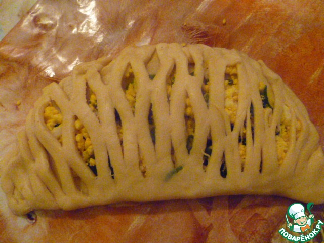 И накрываем начинку частью теста, по которой мы прошлись роликом. Края скрепляем.