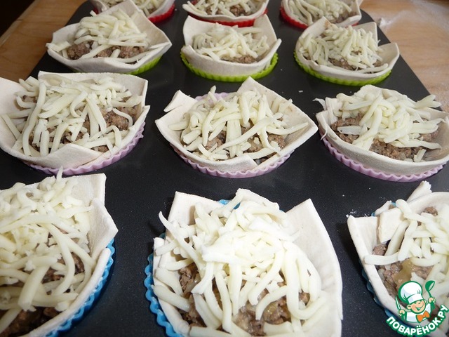 Каждый пласт теста поделить на 3 части. Тесто немного подкатать, выложить в форму для маффинов. На тесто выложить начинку.