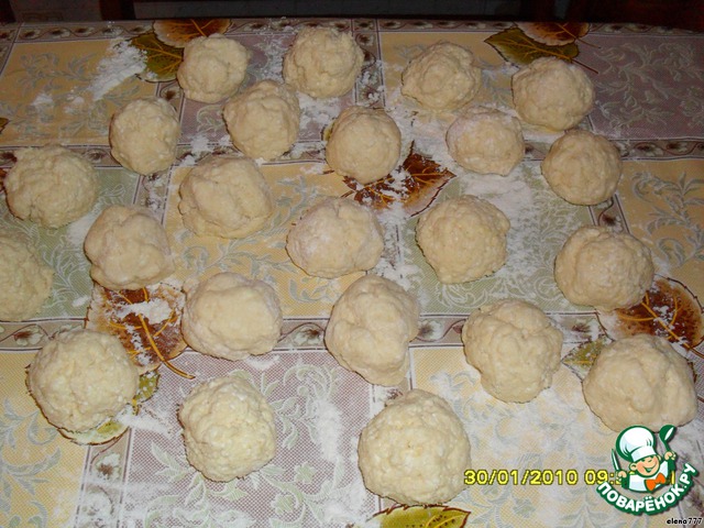 Руки обмакнуть в муку и разделить тесто на шарики, величиной с куриное яйцо.