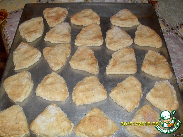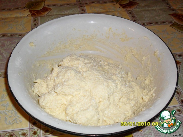 Смешать творог, муку, яйца, 1/2 стакана сахара, рубленное сливочное масло, соду, погашенную соком лимона. Вымесить мягкое, нежное тесто. Оно должно слегка прилипать к рукам. Поставить на холод на 30 минут.