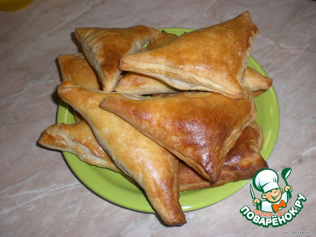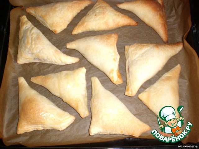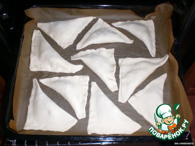 Раскатать тесто до 0,5см, разрезать на квадраты, положить начинку и закрыть немного защипывая.