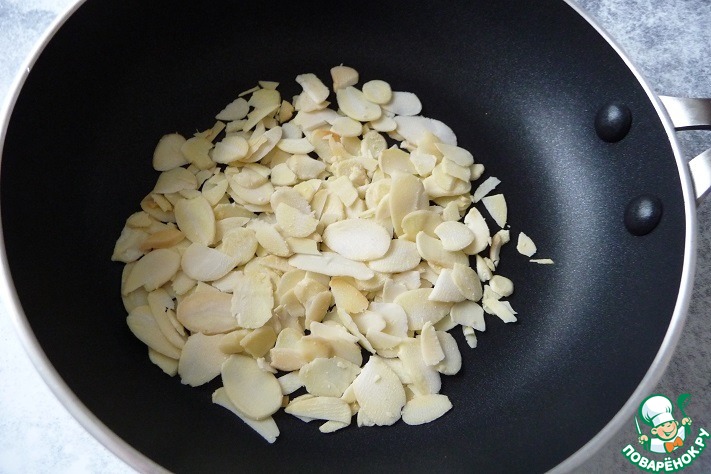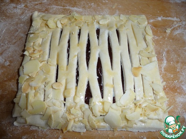Накрыть решеткой, скрепить края, смазать яйцом, украсить миндалем.