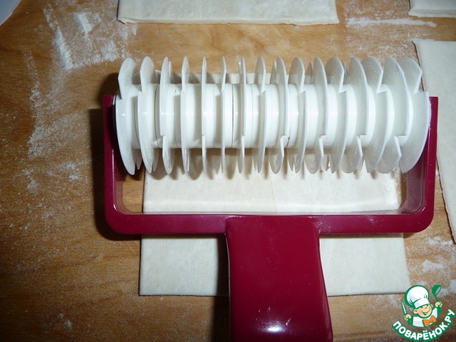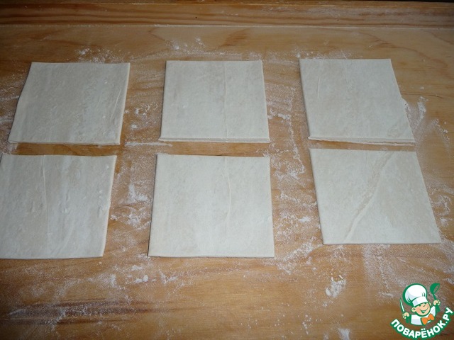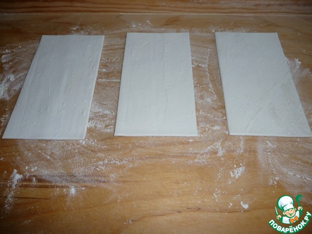 Тесто разделить на две части. Края верхних частей теста (3шт.) смочить водой.