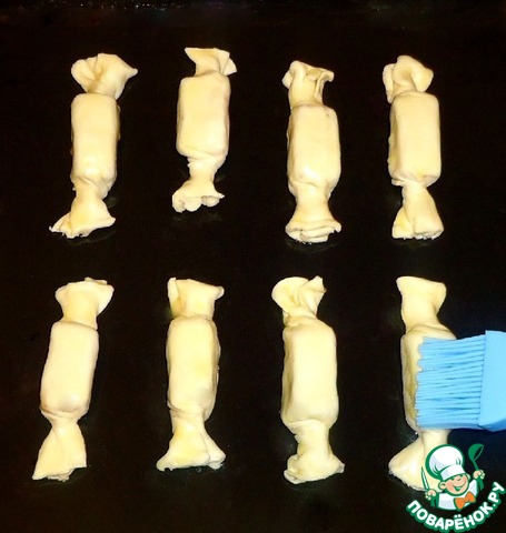 Противень смазать растительным маслом, выложить слойки с начинкой, каждую смазать растопленным сливочным маслом.