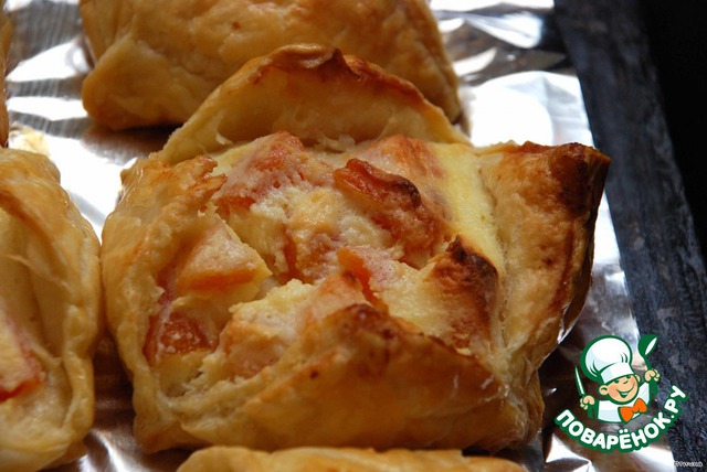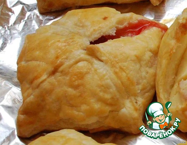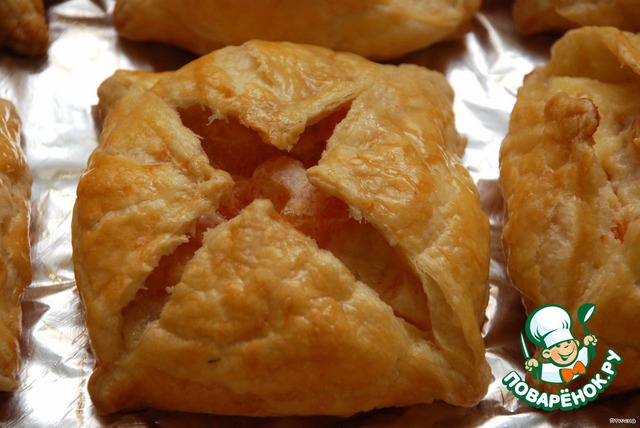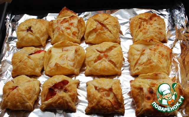 Укладываем наши слоечки на противень, смазываем яйцом и ставим в разогретую до 200*C духовку, до зарумянивания.