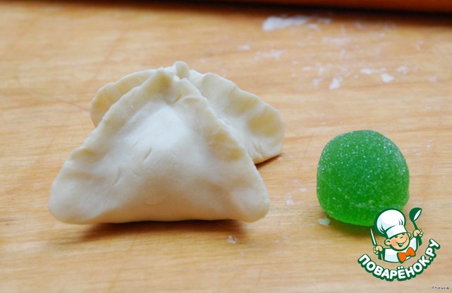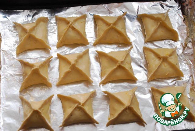 На серединку квадратика кладем начинку и защепляем края, как на фото.