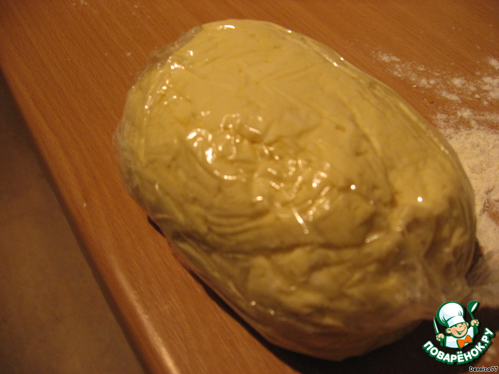 Сначала вымешиваем из муки, творога, маргарина, соли и сахарной пудры гладкое тесто и ставим его в холодильник примерно на полчаса.