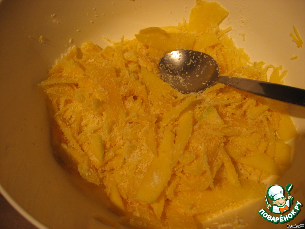 В это время пора заняться начинкой. Чистим манго и нарезаем его, точнее стругаем как можно тоньше. Смешиваем манго с кокосовой стружкой.