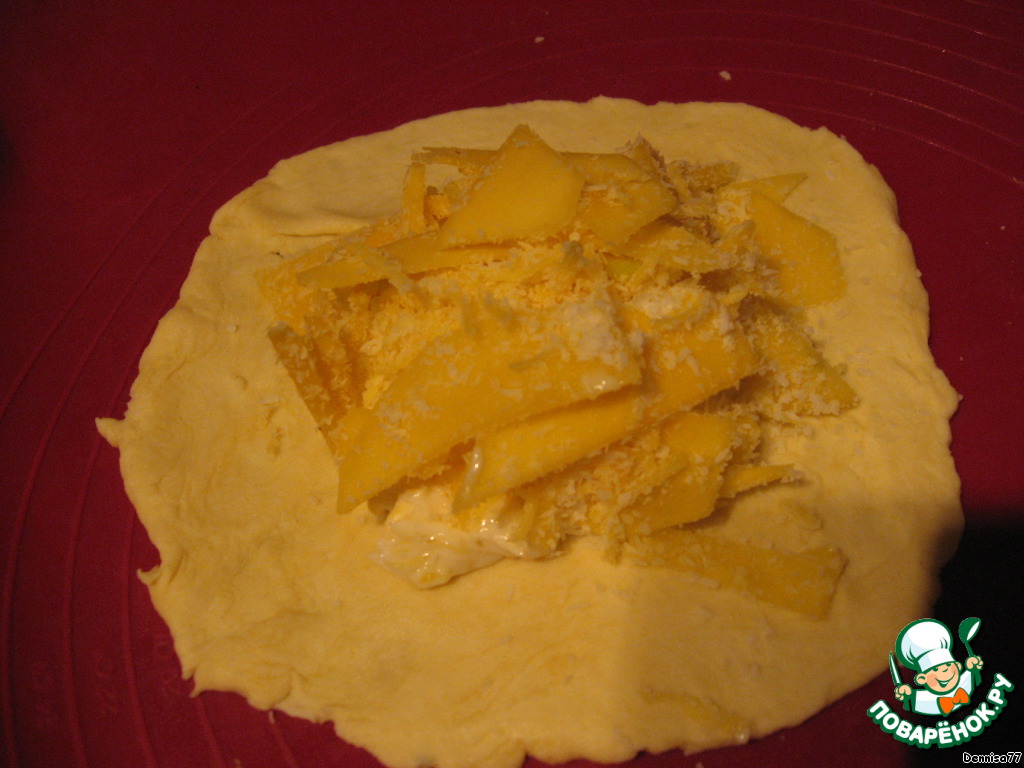 Итак, на каждый квадратик выкладываем примерно 1 столовую ложку творожной начинки, а сверху - ломтики манго. Соединяем противоположные концы, как бы складывая конвертиком.