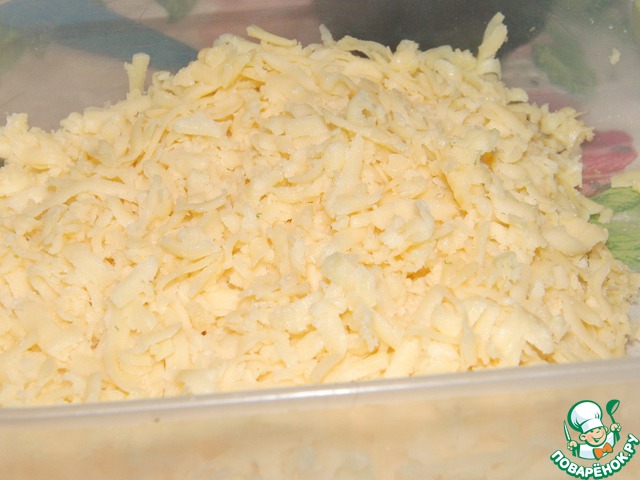 Натереть сыр, я взяла голландский, т. к. мои детки не очень любят моцареллу. Но лучше, конечно, было бы, и правильнее, моцареллу.