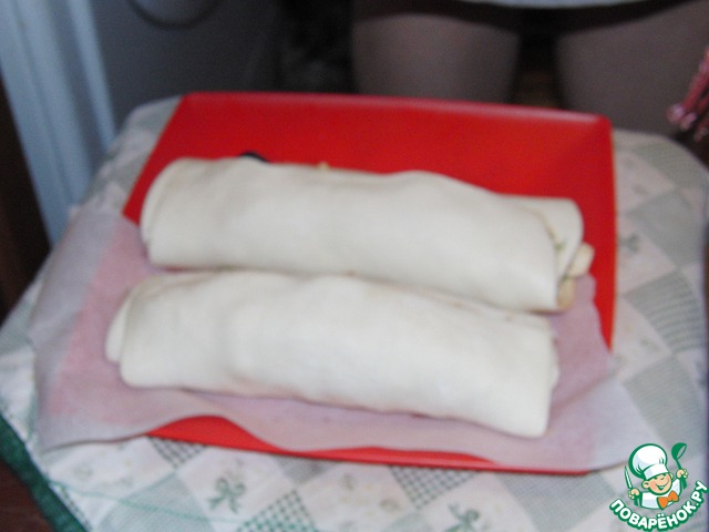 Тесто разморозить при комнатной температуре. Раскатать пласт теста в одном направлении (чтобы оно поднялось и не потеряло форму).