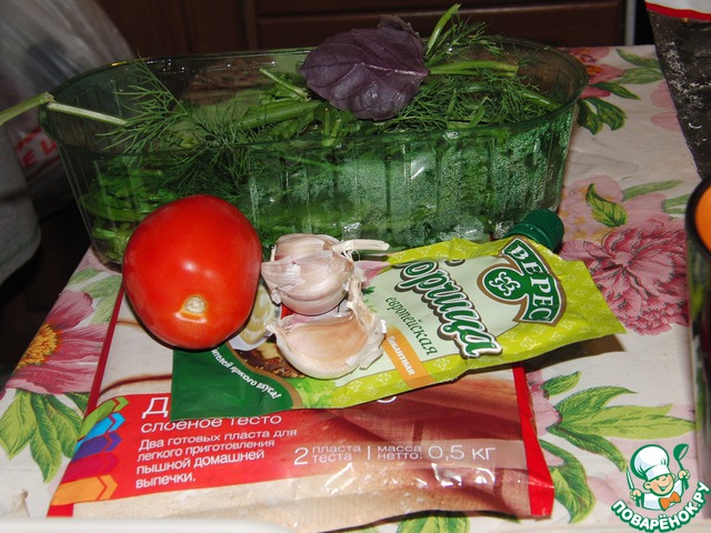 Пласт теста смазать горчицей, послойно выкладывать всю начинку: сначала укроп, потом помидорки и базилик, далее чеснок; все это обильно посыпаем сыром.