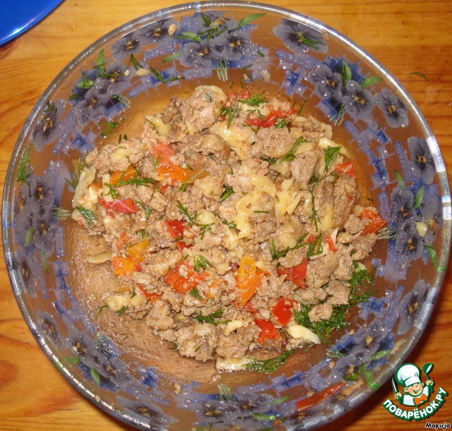 Обжарить фарш, в конце жарки добавить перец болгарский и помидор, посолить и поперчить. Когда фарш немного остынет, добавить тертый сыр и зелень