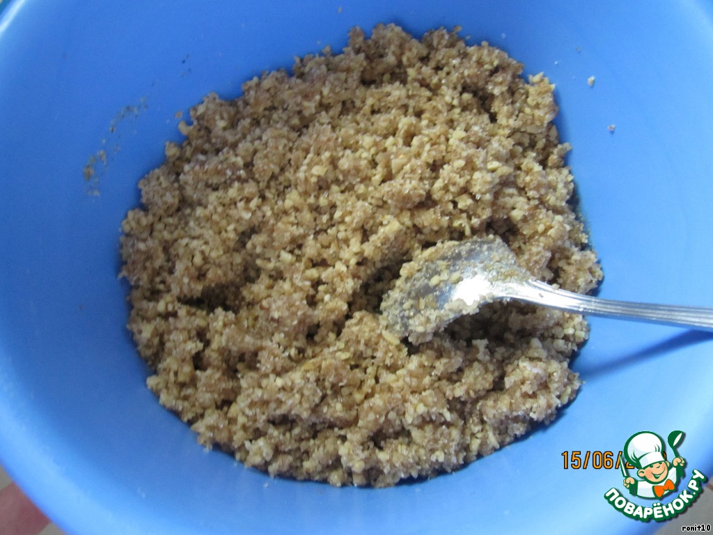 Приготовить начинку: ядра грецких орехов пропустить через мясорубку, добавить сахар, молотую корицу, мед и все перемешать.