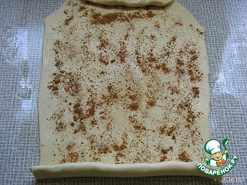 Помазать взбитым яйцом, посыпать молотой корицей и сахаром.