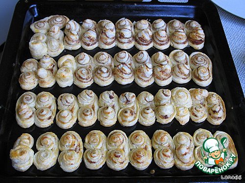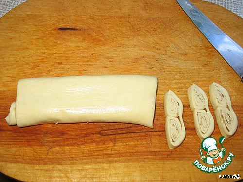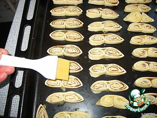 Уложить на сухой противень и смазать яйцом. Выпекать в разогретой духоке при 200 градусах в течение 18-20 минут.
