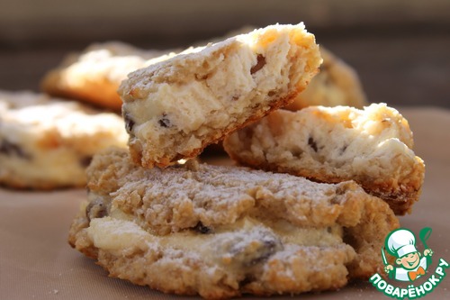Тесто будет липнуть, поэтому руки смачиваем водой, отщипываем от теста небольшой шарик, расплющиваем его пальцами в лепёшку. Начинку намазываем на половинку лепёшки, а другой половинкой накрываем.
