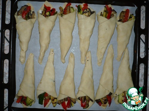 Готовые кулечки смазать яйцом и испечь в разогретой духовке минут 20 при температуре 200*С