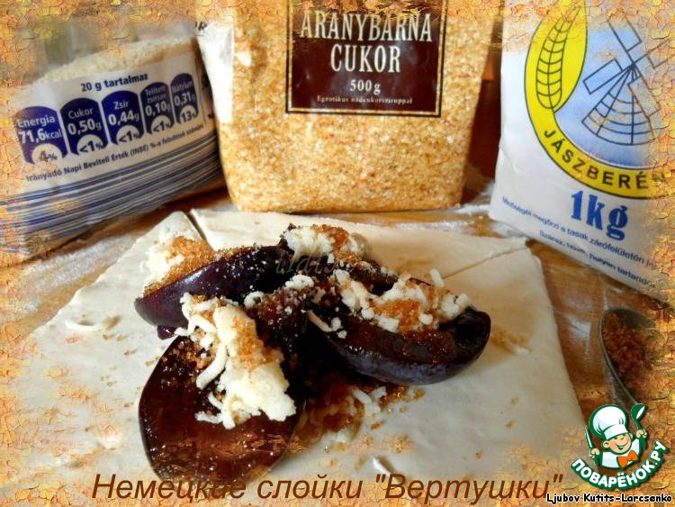 Рецепт этих слоек очень простой. Основа - слоёное тесто, которое можно купить готовое или, например, испечь по моему быстрому рецепту во "французском пироге" по этой ссылке http://www.povarenok.ru/recipes/show/60447/#comment2526124