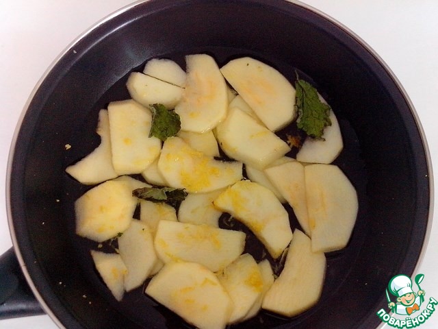 Воду налить в сотейник (сковороду), добавить сахар и перемешать. Поставить на огонь, добавить яблоки, несколько листочков мяты (у меня сухая), цедру лимона. После закипания, варить 1-2 минуты на медленном огне.