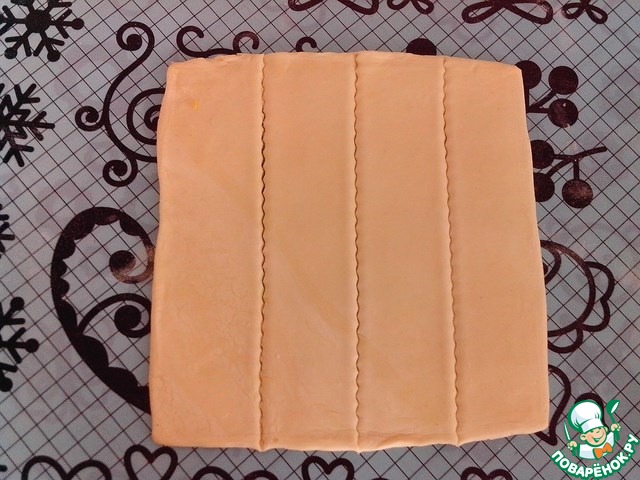 Тесто разморозить заранее. Раскатать его тонко и нарезать полосками. У меня получились полоски 5 см на15 см.