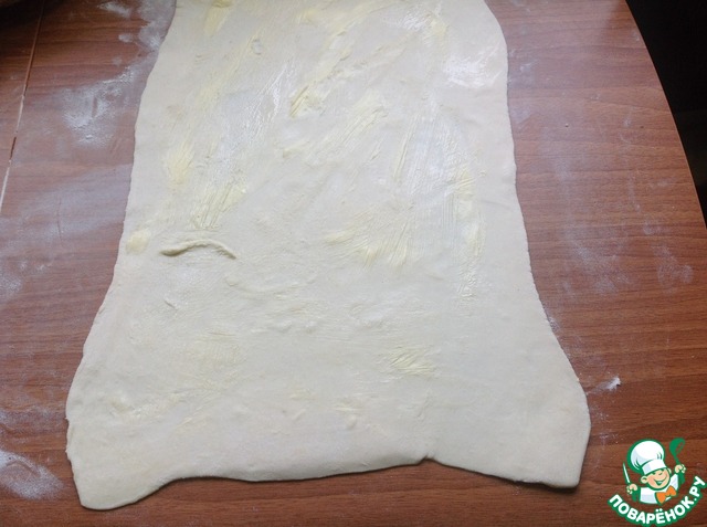 Тесто раскатать и смазать сливочным маслом комнатной температуры