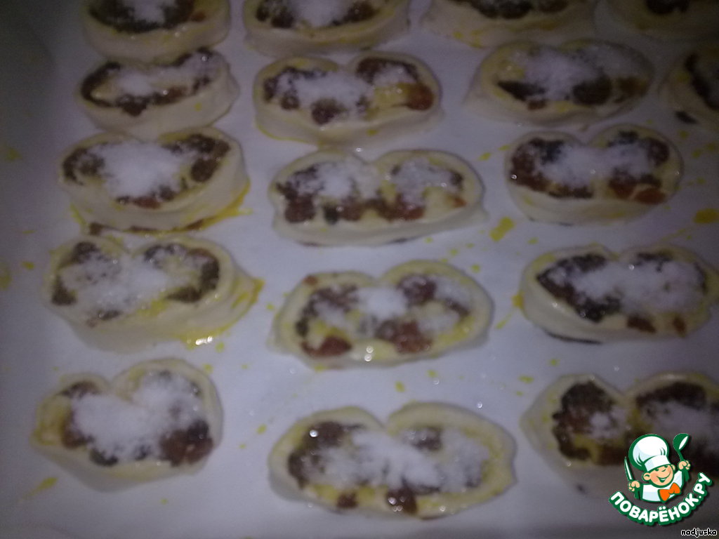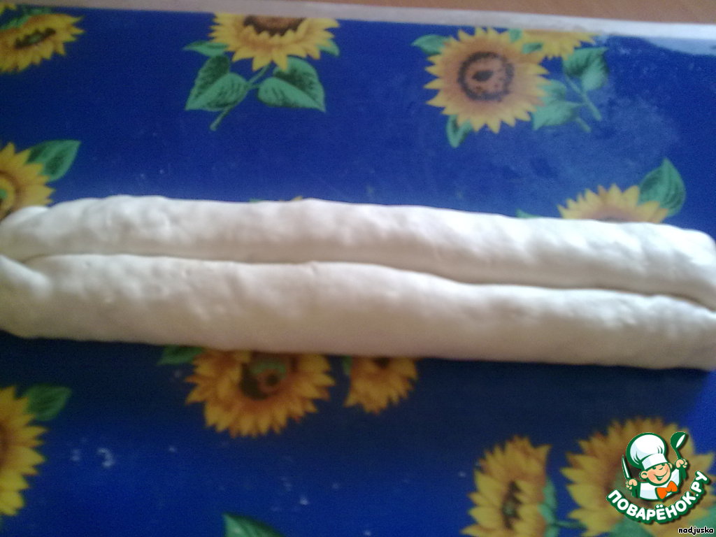 Тесто с изюмом свернуть в рулет до середины пласта, затем повторить эту операцию с другой стороны пласта.