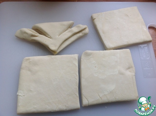 Тесто предварительно размороженое, разрезать на квадраты, свернуть треугольником и сделать надрезы как на фото. Тесто не раскатывать