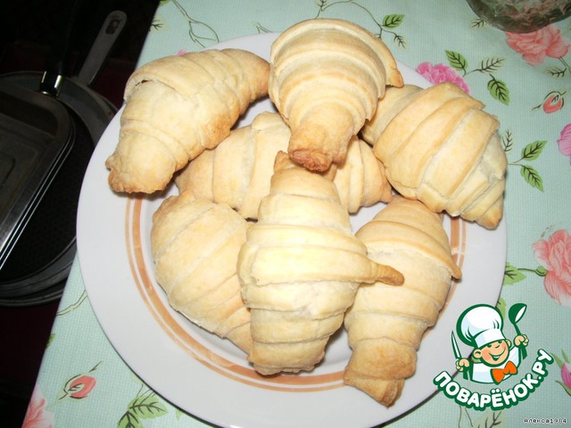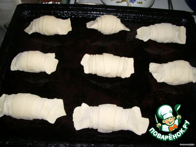 Складываем их на противень и ставим в холодную духовку на 30 минут (у меня духовка старая и иногда она то не поджаривает, то пережаривает), но лучше периодически посматривать, как подрумяниваются круассаны, выпекаем примерно при 180 градусах