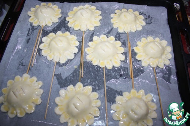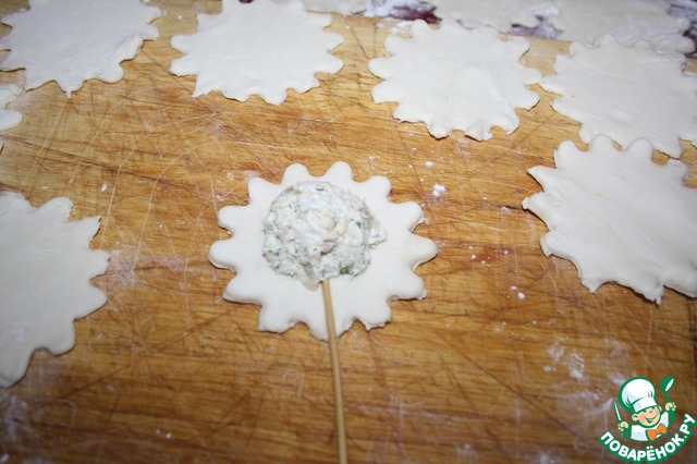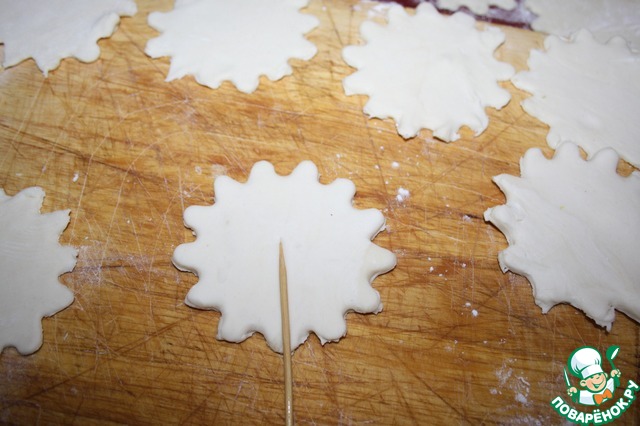 Слоеное тесто разморозить, слегка раскатать (раскатывать сильно нельзя - палочка не будет держаться). Вырезать четное количество ромашек (или других форм, у меня форма диаметром 8 см). Палочки нужно предварительно замочить в воде, чтобы после выпечки они не сильно темнели. Кладем палочку поверх теста, захватывая примерно серединку, и слегка прижимаем палочку к тесту.