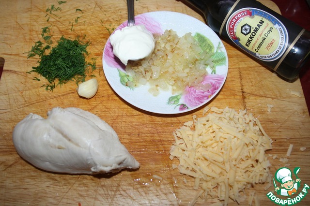 Куриное филе отварить в несоленой воде с душистым перцем и половинкой луковицы около 25 мин. Сыр потереть на терку, другую половину луковицы порезать кубиками и слегка поджарить, укроп и чеснок измельчить. Вареную курицу перемолоть на мясорубке или мелко нарезать, смешать с луком, укропом, сыром, сметаной, соевым соусом, чесноком.