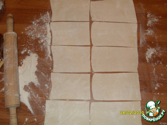 Раскатать тесто в тонкий пласт и нарезать квадратами.