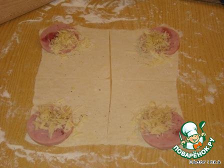 Тесто раскатать, разрезать на части (количество частей зависит от размера пластов). На край каждого кусочка положить ветчину, посыпать сыром и молотым перцем для пикантности. Края подвернуть так, чтобы расплавленный сыр не вытекал и свернуть рулетиком. Пробовала делать слойки в форме круасанов, но самая вкуснотища - сыр вытекает на противень.