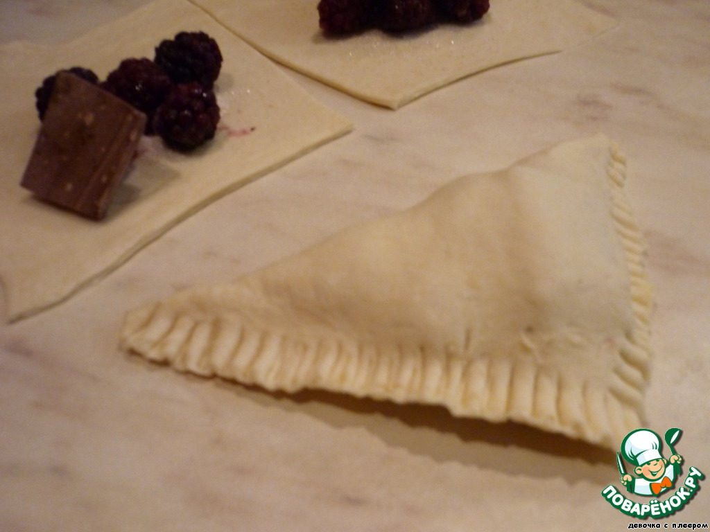 На каждый квадрат теста положить несколько ягод ежевики и слегка присыпать сахаром.