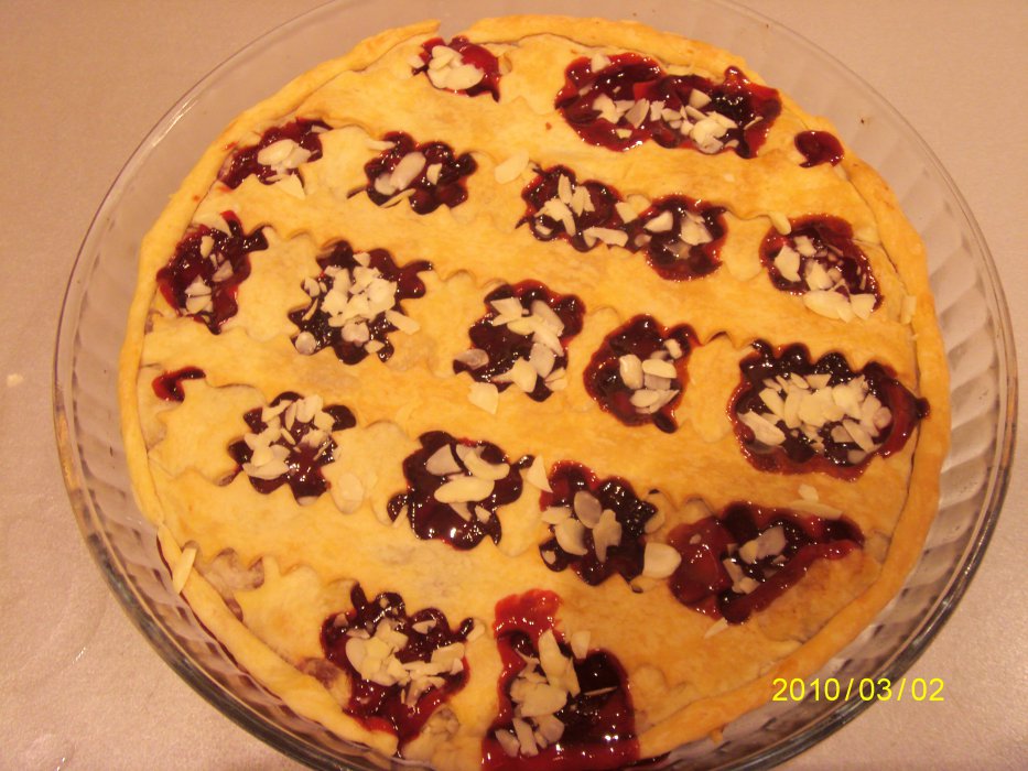 Тесто раскатать, выложить на противень, на тесто выложить начинку, края теста подогнуть роликом, сверху украсить полосками теста. Выпекать в духовке при температуре 200 градусов минут 20 (я выпекала в аэрогриле при т - 240 гр, 30 мин). Уже готовый пирог украсить миндальными лепестками. Начинка у такого пирожка никогда не вытечет, и вы, и ваши детки останутся чистыми после поедания этого пирожка!